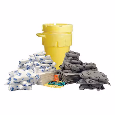 Kit para derrames con capacidad de absorción de 75 galones, ideal para la contención y manejo de líquidos derramados. Incluye un tambor amarillo para facilitar su identificación y uso.