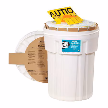 Kit para derrames con un volumen absorbido de 21 galones. Ideal para la recuperación de líquidos en entornos industriales. Incluye un tambor blanco con capacidad de 30 galones.