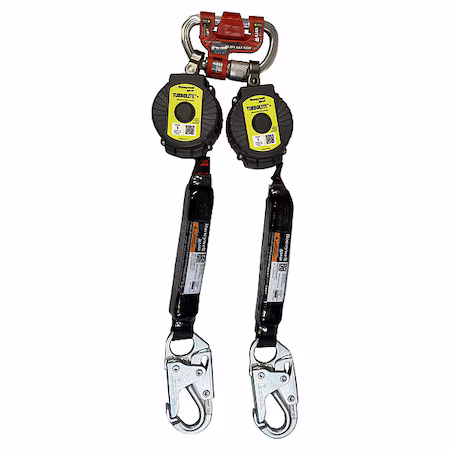 Limitador de caída personal autorretráctil TurboLite+, 6 pies de largo, equipado con mosquetón de aluminio y 2 patas para mayor seguridad en trabajos en altura.