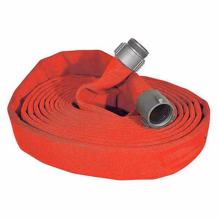 Manguera contra incendios de chaqueta doble, 100 pies de largo, con un diámetro interior de 1 1/2 pulgadas. Fabricada en tubo de poliuretano de color rojo, ideal para aplicaciones de seguridad y protección contra incendios.