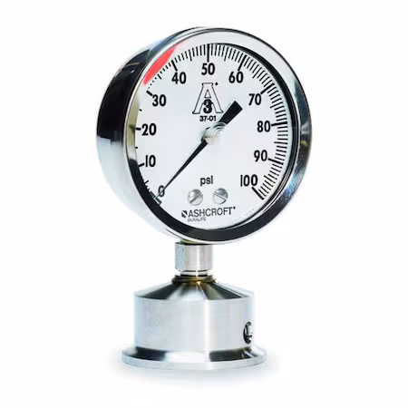 Manómetro ASHCROFT, rango de 0 a 60 psi, con una esfera de 2 1/2 pulgadas y abrazadera triple de 2 pulgadas, diseñado para instalación en la parte inferior.